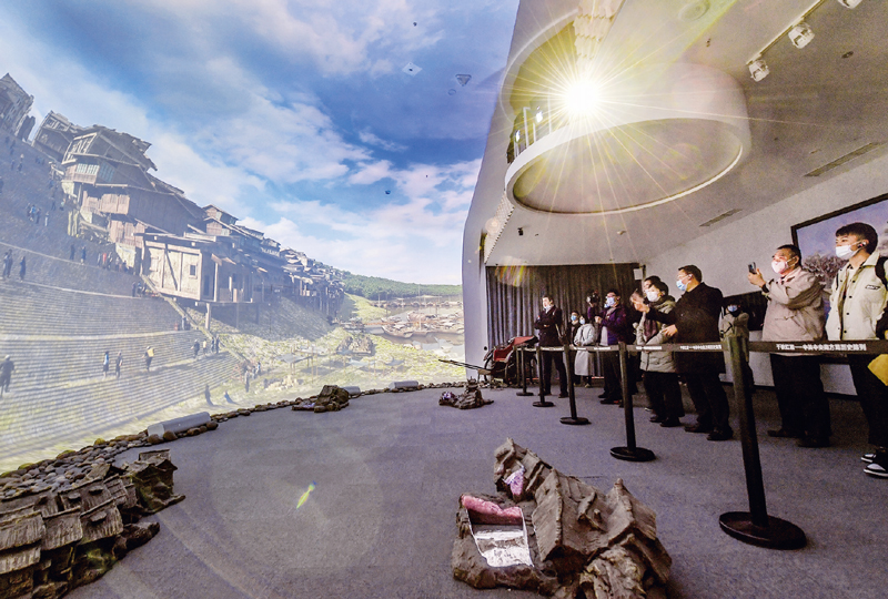 近年来,重庆红岩革命纪念馆以新技术把革命文物搬上屏幕和舞台,创新革命文物展示,让红岩革命文物“活”起来。图为在重庆红岩革命纪念馆“红岩记忆”数字体验厅内,观众们观看以双曲三维穹��>�技术展示的场景。 新华社记者 李贺/摄