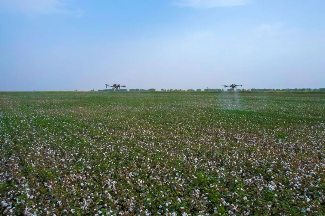 科技加持下,农业生产不再是“靠天吃饭”,而是对农时的精准把握。无人机为棉花田间管理按下“快进键”,让秋日的篇章直接翻到洁白的一页。融通农发乌鲁木齐区域公司2000亩智慧棉田里,使用搭载脱叶剂的植保无人机按照预设航线精准飞行,精准调控药剂用量与喷施时间,确保棉花脱叶均匀、吐絮集中,既省工省本又提质增产。