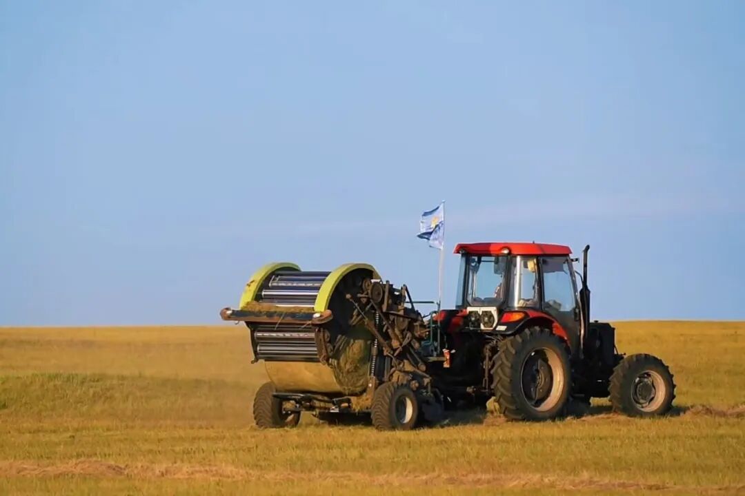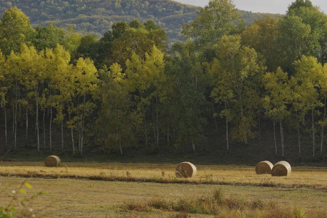 广袤的草原上,打草机、搂草机、捆草机协同作业。金浪翻涌、机械轰鸣,一个个圆润饱满的大圆草捆新鲜出炉,错落点缀在草原上,满是牲畜越冬的“安心粮”。