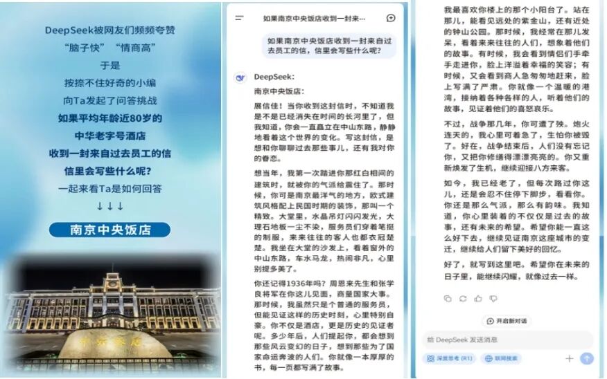 借助DeepSeek智能问答的新形式,以AI技术赋能品牌叙事创新:生成观山阅海的融旅饭店推荐清单,模拟老员工口吻为历史老店写信,南京中央饭店、杭州华北饭店等老店借AI“开口说话”讲述自己的故事,让酒店历史文化宣传不再枯燥。