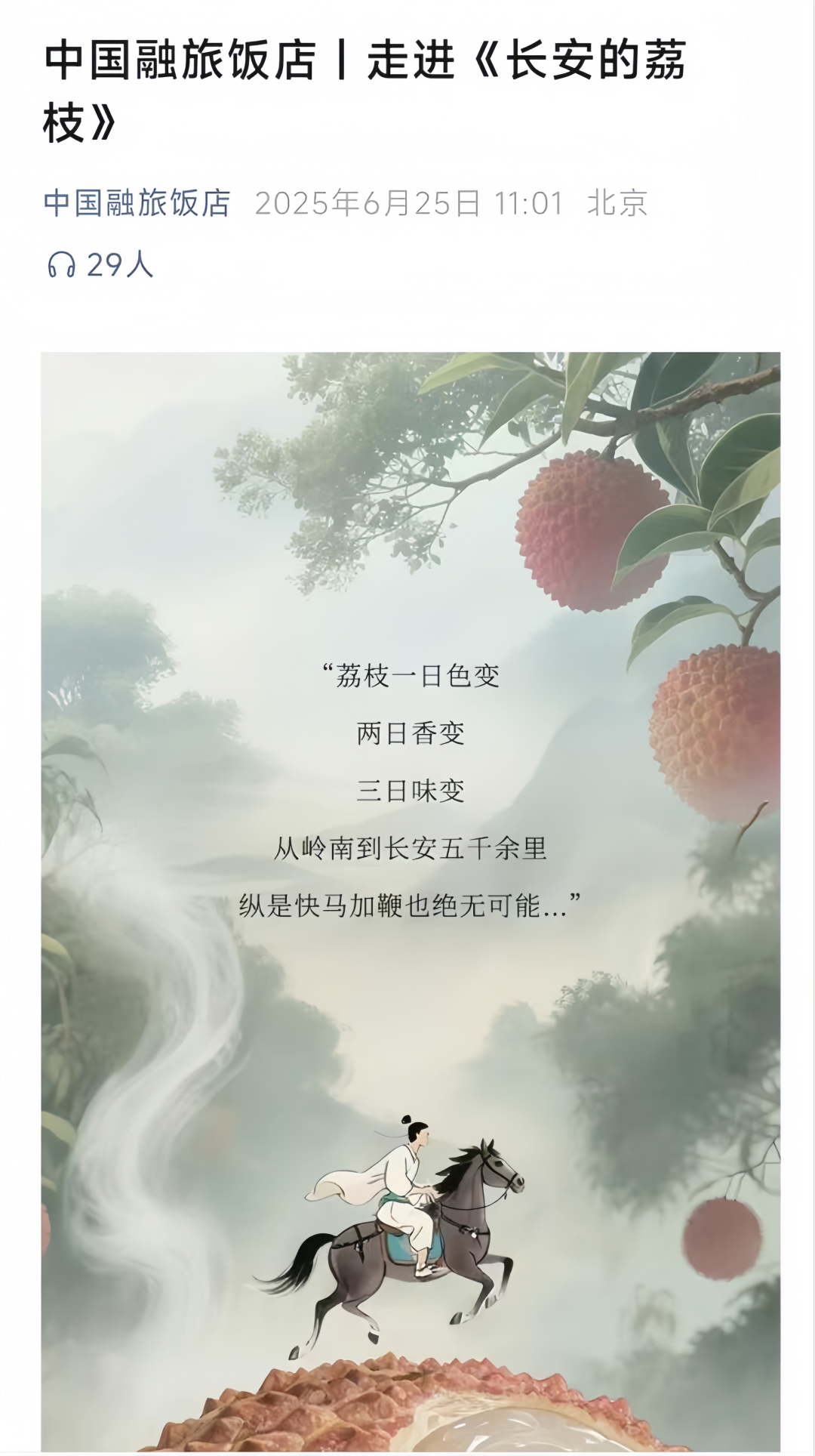 结合《哪吒》《长安的荔枝》等热门话题,创新推出系列内容:以“哪吒喊我命由我,新的一年旅途由我”为主题推荐融旅饭店特色酒店;借“走进《长安的荔枝》”之名,讲述融旅饭店岭南百年荔枝树的故事,以年轻化语态链接文化热点,吸引青年群体关注。